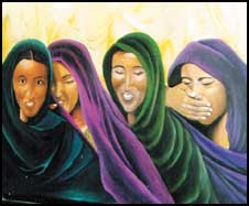 الأميرة أضواء بنت يزيد آل سعود قدمت عملين يتنافسان على جذب الجمهور، وشد انتباه الزوار,, في احدهما تشاهد نساء أربعة بكل وضوح وبلا ضبابية وغموض، ترى في تلك الوجوه ابتسامات حزينة، ونظرات غريبة، ترقب للمجهول، وإنصات لهمسات الواقع الخفي، وتحدٍ للقادم البعيد,, خلف تلك النساء الأربع تلمح امرأة عصرية لم تعش في زمنهن ولم تنظر إليهن وهن لم ينتبهن لها أو لم يردن الانتباه وكأن العصور الزمنية تتقطع وخيوط الزمن تتلفت، فلا صلة بين الماضي والماضي ولا ترابط بين الحاضر والمستقبل نساء يمثلن العالم والعالم لا يشعر، فن يترجم الواقع، والواقع مصر على عكس الواقع,,, أمور تحس بها، وقد لا تتفاعل معها أو,,,.