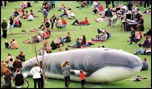 العشرات من الاستراليين يستمتعون بوجودهم في إحدى حدائق اديلايدي جنوب استراليا بجانب بالون عملاق صنع على شكل حوت وذلك بمناسبة بدء اجتماعات اللجنة الدولية لحماية الحيتان والتي يحاول اعضاؤها الحصول على الموافقة لبناء محمية خاصة بالحيتان جنوب المحيط الهادي.