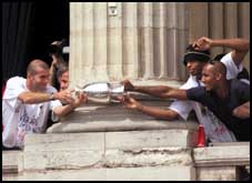 صانع الألعاب الفرنسي زين الدين زيدان يحاول خطف كأس أوروبا من زملائه في الفريق تيري هنري وانيلكا وذلك خلال الاحتفالات التي أقيمت في قصر الكونكورد بباريس عقب وصول أعضاء المنتخب لمقابلة الجماهير السعيدة بالانتصار.