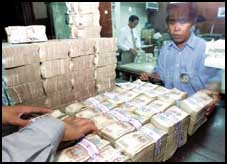 موظفون بأحد البنوك في جاكرتا يقومون بعدِّ اكوام من الروبيات الاندونيسية التي انخفضت الى ادنى معدل لها منذ 16 شهراً والسبب هو احداث العنف التي تعصف ببعض ارجاء البلاد واخرها الانفجار الذي حدث امام مقر النائب العام بجاكرتا.