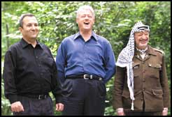 وقهقه الرئيس الأمريكي بيل كلينتون فيما كان باراك وعرفات يتصارعان أمام المصورين في منتجع كامب ديفيد الرئاسي وكل منهما يحاول دفع الآخر للدخول.