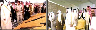 وبعد حفل الغداء قام سمو ولي العهد وسمو النائب الثاني بجولة على جناح الاسلحة حيث استمع الى شرح عن الاسلحة الخفيفة وعن الاسلحة ذات الاستخدام الخاص ثم شاهد في ميدان الرماية مجموعة من العروض تبين مهارات التصويب الفردية وطرق استخدام الاسلحة الخفيفة في مكافحة الارهاب والرماية بالذخيرة الحية والتصويب على اهداف بدقة متناهية كما ظهرت في العرض بعض اللوحات الترحيبية واطلقت في سماء الميدان عدد من البالونات الملونة اضافة الى ارتفاع علم المملكة اثر التصويب على اهداف معينة وقد نالت هذه العروض استحسان الجميع.
