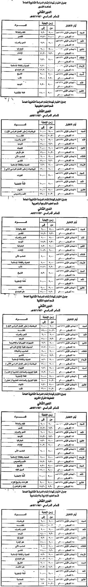 تبدأ يوم السبت 12 جمادى الأولى اختبارات الدور الثاني للطلاب في جميع مراحل التعليم العام, ونظرا لورود الكثير من الاستفسارات من الطلاب وأولياء أمورهم عن جدول اختبارات الثانوية العامة يسر الجزيرة ان تعيد نشر الجداول مساهمة منها في تمكين الطلاب من الاعداد والتهيئة للدور الثاني بالشكل المطلوب, وتشتمل على جميع أقسام الثانوية العامة وهي قسم العلوم الطبيعية وقسم العلوم الشرعية والعربية وقسم العلوم التقنية وتحفيظ القرآن الكريم وقسم العلوم الإدارية والاجتماعية ومعاهد النور.