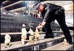 ضابط شرطة يحاول إزالة 150 دمية ثبتت بغراء قوي جداً على درجات سلم مدخل البنك الفيدرالي واكتشفت الدمى من جميع الاشكال والاحجام بواسطة عمال النظافة قبل بزوغ الشمس ويعتقد بأنها مزحة قام بها عدد من الطلاب.