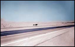 هذه الإبل وقفت على الطريق المسفلت في الصحراء تتربص بالسيارات متحدية لها وهي تنذر بمعركة لا تبقي ولا تذر,, وكأن لسان حالها يقول: لقد حللت ايتها السيارة مكاني واستوليت على دوري,, فأنا سفينة الصحراء,, وأنا اتحداك بكلكلي وجسمي الضخم,, كي احطمك واصحابك,, وهأنذا لك بالمرصاد,,!! ولكن لماذا يدفعها اصحابها (اصحاب الإبل) الى هذه المعركة غير المتكافئة,, سؤال موجه لاصحاب هذه الإبل لإنهاء هذه (الحرب) حرب الإبل السائبة التي حطمت السيارات والإبل وازهقت الارواح,,!!