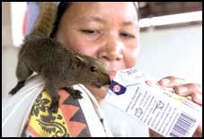 السنجاب سام البالغ من العمر ثلاثة اشهر يرتشف الحليب الذي تقدمه له صاحبة أحد المتاجر في تايلاند حيث اعتاد السنجاب سام على زيارة هذا المتجر خصوصا بعد أن ماتت أمه واصبح يتيما.