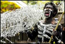 أحد الشبان الإندونيسيين يقف بجانب الأسلاك الشائكة المحيطة بمبنى البرلمان مطلقا الشعارات المؤيدة للرئيس عبد الرحمن وحيد وهو واحد من مئات المتظاهرين الذين احاطوا بالبرلمان بأجساد مصبوغة للتعبير عن غضبهم ازاء عدم تقديم سوهارتو للمحاكمة حتى الآن.