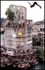 متسابق يقفز من فوق ما تبقى من جسرموستار القديم الذي دُمر خلال الحرب عام 1993م, ويتابعه المشاركون بالقفز من فوقه لقطع مسافة كبيرة جدا قبل الوصول للبحيرة العميقة.