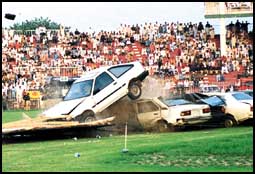 سيارة المغامر الباكستاني سلطان محمد أثناء اصطدامها بعد فشله في القفز من فوق 11 سيارة في استاد جينة وأقيم العرض بمناسبة الاحتفالات بذكرى الاستقلال وقد نجح المغامر في القفز من فوق 10 سيارات فقط.