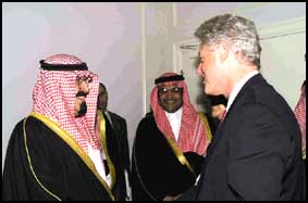 استقبل فخامة الرئيس بيل كلينتون رئيس الولايات المتحدة الأمريكية في مقره في نيويورك مساء أمس الأول بتوقيت نيويورك صاحب السمو الملكي الأمير عبدالله بن عبدالعزيز ولي العهد ونائب رئيس مجلس الوزراء ورئيس الحرس الوطني الذي يشارك في قمة الألفية التي بدأت أمس بمقر الأمم المتحدة في نيويورك.