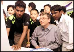 بيل جيتس رئيس شركة مايكروسوفت يجلس أمام شاشة الكمبيوتر مع عدد من الأيتام الماليزيين بالمركز التعليمي التابع للشركة في ماليزيا وقال جيتس في مؤتمر صحفي بأنه سيجعل الإنترنت في متناول الجميع وبأنه سيزيد من قوة الإنترنت لجعلها أكبر مصدر للمعلومات من أي مكان في العالم.