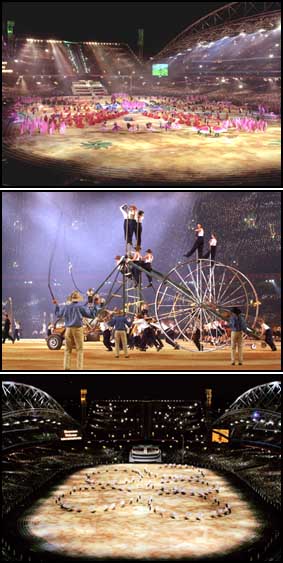 وتوافدت مجموعات بشرية مزدانة بالألوان الأصفر والأحمر والأخضر والأسود والأزرق ومؤلفة من 1750 صبيا وصبية الى منتصف الملعب ممثلة القارات الخمس ومشكلة الدوائر الأولمبية الخمس التي ترمز الى هذه القارات أيضا.
