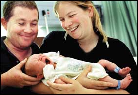 الاسترالية ستايس جونستون تقف بجانب زوجها وهي تحمل طفلها الرضيع جوردن في احد مستشفيات بيرث الاسترالية, الطريف في الامر ان هذه الام وضعت الطفل في دورة مياه المستشفى بدون علم مسبق بأنها حامل حيث انها دخلت المستشفى وهي تظن انها تعاني من تقلصات معويه الا انها انجبت طفلاً سليماً مكتمل النمو.