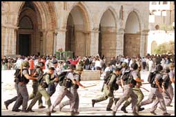 وكان الآلاف من الفلسطينيين قد توافدوا الى المدينة لأداء الصلاة في المسجد الأقصى استجابة للنداءات التي أطلقتها منظمات اسلامية وشعبية مختلفة للاحتجاج على الاقتحام الذين قام به زعيم حزب الليكود اليميني أرييل شارون يوم الخميس الى المسجد.