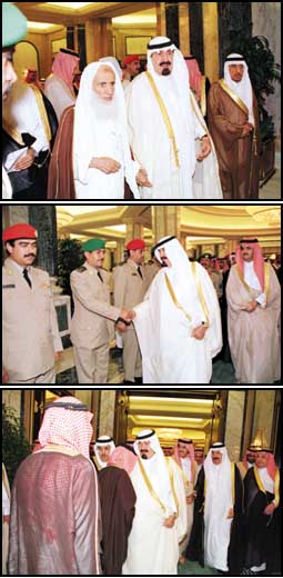 استقبل صاحب السمو الملكي الأمير عبدالله بن عبدالعزيز ولي العهد نائب رئيس مجلس الوزراء ورئيس الحرس الوطني في مكتب سموه بالديوان الملكي بقصر ساليمامة أمس أصحاب السمو الملكي الأمراء وفضيلة الشيخ محمد بن صالح بن عثيمين عضو هيئة كبار العلماء والاستاذ بكلية الشريعة وأصول الدين بجامعة الإمام محمد بن سعود الإسلامية فرع القصيم وامام وخطيب الجامع الكبير بعنيزة وأصحاب المعالي الوزراء وكبار المسؤولين وكبار قادة وضباط الحرس الملكي يتقدمهم معالي رئيس الحرس الملكي الفريق أول ركن عبدالله علي النملة الذين قدموا للسلام على سمو ولي العهد وتهنئته بسلامة الوصول إلى الرياض.