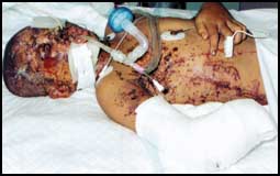 ويخضع المصاب زياد يوسف بركة 15 سنة المصاب ببتر في الذراع اليسرى وجروح في كامل الجسد جراء انفجار تعرض له في 7 اكتوبر 2000م للعلاج وبين الفريق الطبي المشرف على علاجه انه كان فاقداً لاحد عينيه قبل نقله للتخصصى اضافة الى تضرر عينه اليمنى بشكل كامل,, وسيتم اجراء عملية جراحية لازالتها,, اضافة الى بتر في ذراعه الايمن وسينظر ما الذي يمكن عمله مستقرة، وحالته الى حد ما مستقرة حتى امس الاول الاثنين.