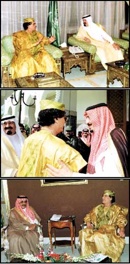 رأس صاحب السمو الملكي الأمير عبدالله بن عبدالعزيز ولي العهد ونائب رئيس مجلس الوزراء ورئيس الحرس الوطني وأخوه فخامة الأخ قائد الثورة العقيد معمر القذافي جلسة المباحثات الرسمية التي عقدت في قصر سمو ولي العهد بالرياض أمس.