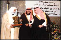 وفي ختام الحفل قدم صاحب السمو الملكي الامير سعود بن نايف هدايا تذكارية لكل من الدكتور عبدالله التركي والدكتور عبدالله العبيد وبنك فيصل الاسلامي على رعايته للحفل.