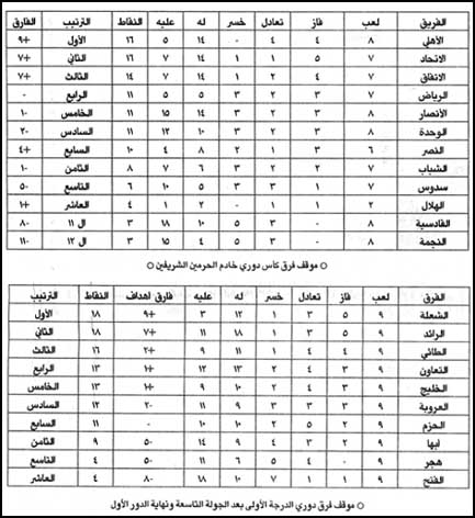 * يتصدر فريق الأهلي فرق كأس دوري خادم الحرمين الشريفين بفارق الأهداف عن منافسه التقليدي الاتحاد الذي يحتل المرتبة الثانية وفي دوري الدرجة الأولى يتصدر الشعلة بفارق الأهداف عن الرائد الذي يحتل المرتبة الثانية.