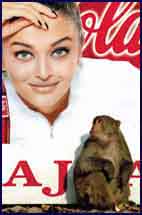 قرد ينظر الى لوحة اعلانات تظهر فيها ملكة جمال العالم الهندية في أحد شوارع نيودلهي التي يوجد بها حوالي 7000......
