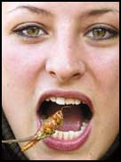 فتاة ألمانية تبلغ من العمر 20 عاما تتذوق جرادة في أحد المطاعم التي بدأت بتقديم وجبات مكونة من الحشرات والديدان وغيرها .