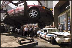 والتقط مصور لرويترز لقطات لحطام سيارة الشرطة بلونيها الابيض والازرق وسيارة حمراء فولكس فاجن باسات بعد انقلابها على جانبها في الناحية التي يجلس فيها ال.........