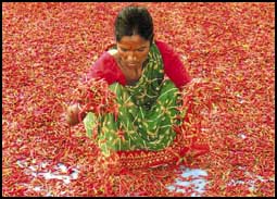 هندية منهمكة في تجفيف محصولها من الفلفل الحار الذي تشتهر به الهند في قرية تبعد 100كم من كلكتا.. وتقول إنها تكسب دولارين فقط كل يوم بعد بيع عدة كيلوجرا.........