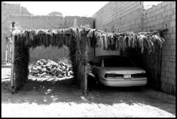 مظلة في الشارع بشقراء من عسيب النخيل يحذر منها الدفاع المدني في المزارع فكيف تكون الخطورة وهي في الشارع يلهو الأطفال بجوارها بالالعاب النارية
