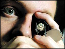 البلجيكي سباستيان كار أحد العاملين في مجلس الألماس في بلجيكا يفحص احدى قطع الألماس قبل طرحها في أسواق المجوهرات في بلجيكا التي تعتبر مركز تجارة الألما.........