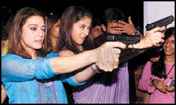 نجمات من السينما الهندية بريتي زينتا «يسار» وأورميلا ماتوندكر يصوبن أسلحتهن نحو بالونات ملونة وذلك خلال زيارتهن لمركز خيري يهدف إلى جمع الأموال من أجل.........