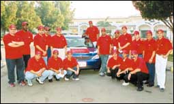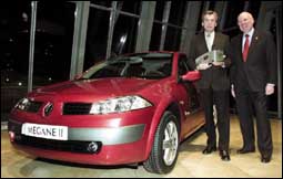 المدير التنفيذي لشركة رينو الفرنسية يقف بجوار رئيس هيئة التحكيم لجائزة «سيارة العام الأوروبية 2003» في مدينة بيل باو بإسبانيا بعد أن فازت سيارةرينو مي.........