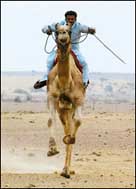متسابق على بعير ينطلق بأقصى سرعة خلال مهرجان الصحراء في ولاية راجستان الهندية الغربية، حيث يجتذب هذا المهرجان عشرين ألفاً من الناس كل عام، غير أن صناع.........