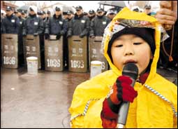 طفل كوري جنوبي خلال مشاركته في تظاهرة عند مدخل القاعدة العسكرية الأمريكية في العاصمة سول، وطالب المتظاهرون القوات الأمريكية بتسليم قواعدها والانسحاب م.........