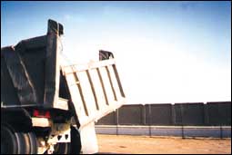 قائد هذه الشاحنة ضرب بجميع قواعد السلامة المرورية عرض الحائط بقيامه بربط باب القلاب بأسياخ للمباني دون اكتراث مما قد يحدث في حال سقوطه في الطريق أضرار.........
