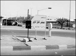 تراكم اللوحات بشكل مجموعات بجوار الاشارات يسبب حجباً للإشارة عن السيارات وتشويهاً للأرصفة، «شارع المدينة المنورة» بالرياض. * محمد عبدالله الحميضي
