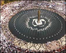 عشرات الآلاف يحيطون بمبنى السفارة الأمريكية في جاكرتا العاصمة الإندونيسية خلال تظاهرات احتجاج جرت أمس على الحرب الأمريكية في العراق.