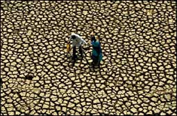 هنديان يمران وسط بحيرة جافة بولاية أندرابراديش الهندية، وتشهد أنحاء واسعة من الهند موجة حر وجفاف كبيرة وقد لقي مائة شخص مصرعهم جراء هذه الموجة.