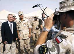 قال وزير الدفاع الامريكي دونالد رامسفيلد للعراقيين في مقابلة سجلت على شريط فيديو يوم الجمعة ان المخربين والقناصة والارهابيين لن يطردوا قوات التحالف من.........