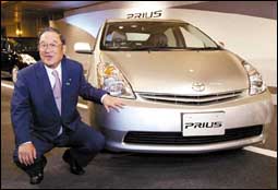 رئيس شركة تويوتا موتورز «فوجوكو» يجلس بجانب الجيل الثاني من سيارة prius«بريس» والتي تم انتاجها عام 1997م وهي الأولى في العالم التي يتم انتاجها على نطا.........