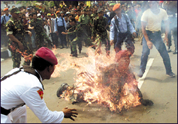 جنود إندونيسيون يحاولون إنقاذ زميل لهم اشتعلت فيه النيران جراء إصابته بقذيفة، ونقل المصاب لاحقا إلى المستشفى ولم يعرف مصيره حتى الآن.