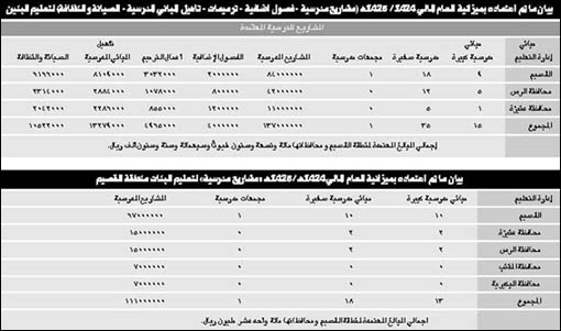 وافق معالي وزير التربية والتعليم الدكتور محمد بن أحمد الرشيد على اعتماد ثلاثة وثمانين مبنى تعليمياً للبنين والبنات في منطقة القصيم بتكلفة اجمالية بلغت قرابة «281» مليون ريال اضافة الى بعض اعمال الصيانة والترميمات والاضافات وتأهيل المباني المدرسية القائمة.