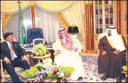 سمو ولي العهد وسمو النائب الثاني لدى اجتماعهما بالرئيس الباكستانيولي العهد يبحث مع مشرف المستجدات الدولية والإسلامية