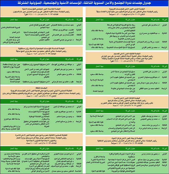 ويشارك في رئاسة جلسات الندوة عدد من أصحاب المعالي كما تنظم اللجنة العلمية للندوة طاولتين مستديرتين حول قضايا المجتمع والأمن، وقد عبر مدير عام الكلية اللواء عبدالرحمن الفدا المشرف العام على الندوة عن بالغ تقديره وتقدير منسوبي الكلية بهذه الرعاية الكريمة من لدن صاحب السمو الملكي الأمير أحمد بن عبدالعزيز نائب وزير الداخلية والدعم المستمر من الأمير نايف بن عبدالعزيز وزير الداخلية والاهتمام المباشر من صاحب السمو الملكي الأمير محمد بن نايف مساعد وزير الداخلية للشؤون الأمنية وقد أنهت اللجان العاملة في الندوة والمعرض كافة الأعمال وأصدرت اللجنة العلمية الجدول النهائي على النحو التالي: