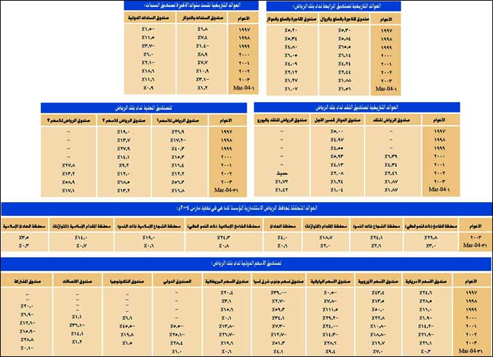 ويوضح الجدول التالي العوائد التاريخية لصناديق الأسهم الدولية لدى بنك الرياض: