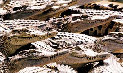 تماسيح في أحد مزارع تايلاند تمت مصادرتها من أحد المشتبهين بالتعامل في المخدرات استعداداً لبيعها في مزاد علني. ويذكر أن جلود التماسيح من أغلى أنواع الج.........