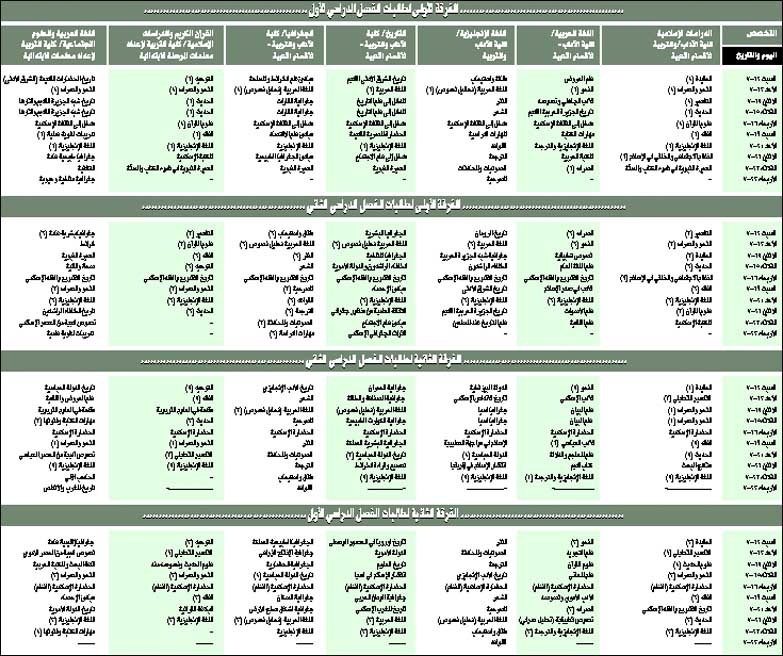 ويستثنى من الفئة الثانية من استحقت طي القيد بسبب رسوبها في أربعة مقررات فأكثر من مقررات الفصل الدراسي الثاني لعام 1424-1425هـ فلا تمكن من دخول اختبار ذوات الأعذار. وفيما يلي جدول الاختبار التكميلي: