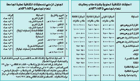 أكد ذلك سعادة الدكتور عبدالرحمن بن حمد الداود عميد شؤون الطلاب بالجامعة وقال إن هذه المسابقات تنفذ ضمن خطة الأنشطة الطلابية التي تلقى الرعاية والتوجيه من معالي مدير الجامعة الدكتور محمد بن سعد السالم.وتشمل المسابقات على مسابقة القرآن الكريم (بثلاثة فروع) ومسابقة الحديث الشريف (بفرعين)، والمسابقة الثقافية العامة والتي ستكون على مرحلتين الأولى تحريرية والأخرى تصفية نهائية وستكون شفهية أمام الجمهور.بالإضافة إلى مسابقات أدبية تشتمل على الإلقاء، والشعر، والمساجلة الشعرية، والمقالة، والقصة القصيرة، والبحوث العلمية والثقافية والاجتماعية.