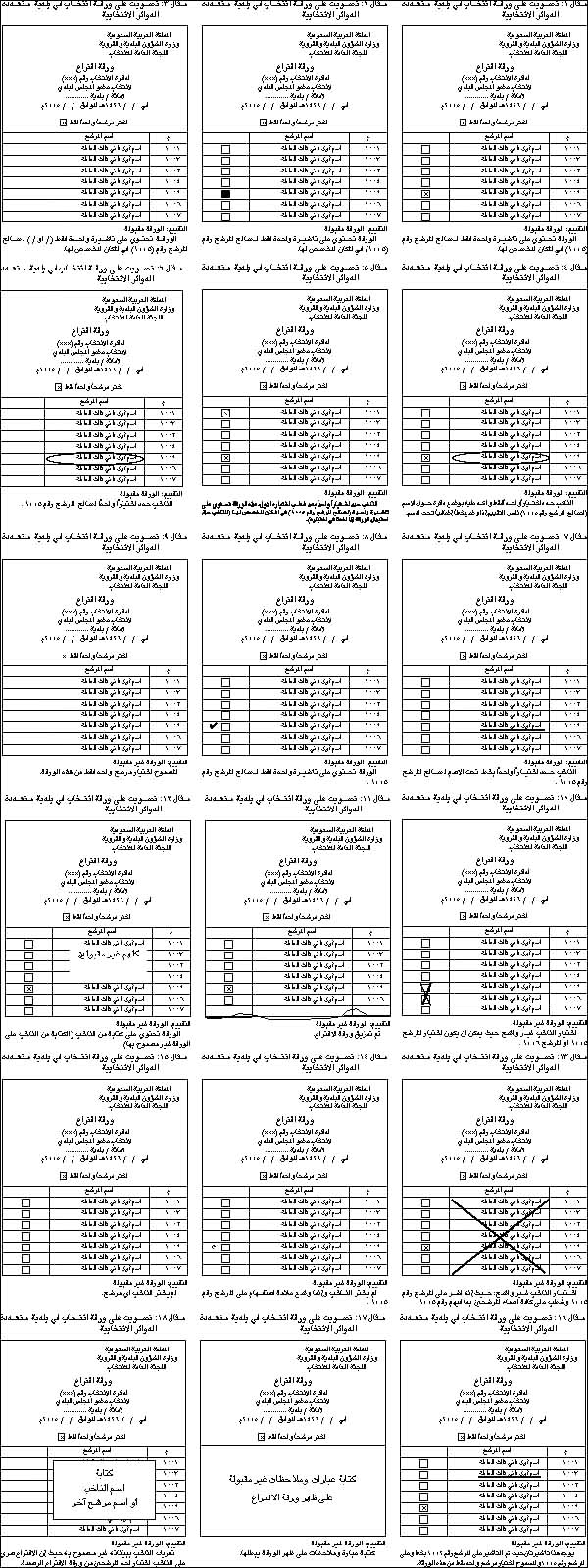 تعد أوراق الاقتراع باطلة عند الفرز في الحالات التالية: - عند كتابة أسماء مرشحين أو غيرهم على ورقة الاقتراع. - إذا لم تكن أوراق الاقتراع مختومة بختم لجنة الانتخاب والفرز. - إذا تم التأشيد في ورقة الاقتراع الخاصة بالدائرة (القائمة) الواحدة على أكثر من مرشح واحد. - إذا علق التصويت على شرط.......... |