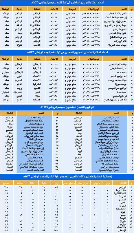 * تقرير - سلطان المهوس: أصدر الاتحاد العربي السعودي لكرة القدم إحصائية الحكام العاملين بالاتحاد العربي السعودي لكرة القدم للموسم الرياضي 1426هـ حيث بلغ عدد الحكام المسجلين رسمياً في سجلات الاتحاد ستمائة واثنين وأربعين حكماً من مختلف الدرجات بما فيهم الحكام المستجدون الذين تم اعتمادهم مؤخراً من قبل رئيس الاتحاد العربي السعودي لكرة القدم صاحب السمو الملكي الأمير سلطان بن فهد. الإحصائية التي حصلت (الجزيرة) على نسخة منها أظهرت بياناً مفصّلاً عن عدد الحكام في كل منطقة، كما كشفت أعداد الدوليين ومساعديهم وحكام كافة الدرجات. لجنة حكام الرياض في الصدارة الإحصائية أظهرت أن لجنة الحكام الفرعية بمنطقة الرياض، التي يرأسها الدولي المعتزل عبد الرحمن الزيد جاءت في صدارة المناطق بالنسبة لعدد الحكام، حيث بلغ عدد حكام لجنة الرياض مائة وستة وعشرين حكماً (126)، منهم ستة حكام دوليين هم: ناصر الحمدان وظافر أبو زندة ومعجب الدوسري وممدوح المرداسي وعلي المطلق وإبراهيم النفيسة، فيما بلغ عدد المساعدين الدوليين اثنين هما: مهنا الشبيكي ومحمد سعد بخيت .. ومما يجب ذكره أنّ لجنة حكام الرياض الفرعية يتبعها إداريا إضافة إلى الرياض خمسة مكاتب هي: المجمعة والزلفي وشقراء والخرج والدوادمي. عسير ثانياً لجنة الحكام الفرعية بمنطقة عسير حلت في المركز الثاني بالنسبة لعدد الحكام، فقد بلغ عدد الحكام التابعين للجنة خمساً وثمانين حكماً (85) لا يوجد بينهم حكم ساحة دولي، بينما يوجد حكم مساعد دولي واحد هو محمد حامد، ويرأس لجنة حكام منطقة عسير محمد البشري عضو اللجنة الرئيسة للحكام كما أنّ منطقة عسير هي الأكثر حكاماً من ناحية عدد المستجدين، حيث بلغ عددهم ثلاثة وتسعين مستجداً (93). القصيم ثالثاً لجنة حكام منطقة القصيم التي يرأسها الدولي محمد المقيطيب حلت في المركز الثالث من حيث عدد الحكام، حيث بلغ عدد حكام القصيم ثلاثة وستين حكماً (63) بينهم دولي ساحة هو عبد الرحمن الجروان ومساعد دولي إبراهيم الدباسي وتعتبر لجنة القصيم في المركز الثاني بعد لجنة الرياض في عدد حكام الدرجة الأولى حيث بلغ عددهم تسعة وعشرين حكماً (29). الحدود الشمالية الأقل جاءت لجنة حكام منطقة الحدود الشمالية الفرعية التي تم اعتمادها مؤخراً في المركز الأخير في عدد الحكام العاملين، حيث بلغ عددهم ثمانية حكام فقط بينهم خمسة حكام (أولى) وواحد (ثانية) واثنان (مستجدان). المراقبون (الجزيرة) حصلت على أسماء المراقبين الفنيين المعتمدين للموسم الرياضي 1426هـ، حيث وصل عددهم إلى (36) مراقباً فنياً السواد الأعظم منهم من منطقة الرياض وقد جاء على رأس القائمة الأستاذ عمر الشقير رئيس لجنة الحكام الرئيسية السابق ونائبه الأستاذ عبدالله الناصر، فيما جاءت منطقة القصيم في المرتبة الثانية بوجود الرباعي الحميميدي والعقيلي والمقيطيب والحميد. الحكام الدوليون بلغ عدد الحكام الدوليين المعتمدين رسميا تسعة حكام كان آخرهم الحكم الدولي عبد الرحمن الجروان والذي تم اعتماده دوليا الموسم الماضي .. ومن خلال بيانات الحكام الدوليين يتضح أنّ سبعة منهم يعملون في قطاع التربية والتعليم ما عدا الحمدان والنفيسة فهما موظفان حكوميان في قطاعي الداخلية والصحة. المساعدون الدوليون بلغ عدد المساعدين الدوليين عشرة حكام وآخر من تم اعتماده في القائمة هما الحكمان إبراهيم النعمي وعبد العزيز الكثيري، ويلاحظ أن الحكمين محمد حامد ومحمد سعد هما الوحيدان اللذان يعملان في القطاع العسكري، بينما توزع البقية في مجال التربية والتعليم والوظائف العامة. الرياض والقصيم الأبرز لسنة حكام الرياض ولجنة حكام القصيم الفرعيتان هما الأبرز من حيث الأسماء التحكيمية ومن حيث العدد الكمي لتكاليف المباريات، فالدوليون الستة في الرياض يتحملون الكثير من تكاليف المباريات، إضافة إلى حكام القصيم. الشرقية والمساعدون تنفرد لجنة حكام المنطقة الشرقية التي يرأسها الحكم الدولي القدير عمر المهنا بأنّها الأكثر عدداً للحكام المسا