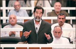 * بغداد - الوكالات: حددت المحكمة العراقية الخاصة التي تحاكم صدام حسين 28 تشرين الثاني - نوفمبر موعداً للجلسة المقبلة من محاكمة الرئيس العراقي السابق وسبعة من معاونيه، وكان محاميه خليل الدليمي طالب بإرجاء المحاكمة التي بدأت أمس الأربعاء، مدة ثلاثة أشهر، ويحاكم صدام حسين (68 عاماً) مع سبعة مسؤولين آخرين بتهمة قتل 143 قروياً من الدجيل الشيعية (شمال بغداد) وتدمير ممتلكاتهم وجرف أراضيهم إثر تعرض موكبه لمحاولة اغتيال عام 1982م. ورفض الرئيس العراقي السابق صدام حسين في بداية محاكمته مع سبعة من مساعديه أمس التعريف بهويته لرئيس المحكمة، مؤكداً أنه (يحتفظ بحقه الدستوري كرئيس لجمهورية العراق). وقال صدام حسين لرئيس المحكمة الخاصة القاضي الكردي رزكار محمد أمين الذي كان يطلب منه هويته (لا أجيب المحكمة واحتفظ بحقي الدستوري كرئيس). وأضاف (لا اعترف بالعدوان وكل ما يبنى على باطل هو باطل). ورد القاضي (سيد صدام.. نحن نعرف حضرتك بالإمكان تقديم نفسك). وقال صدام: (لن أعلق على طلبك للهوية.. لن أجيب هذه التي سميت محكمة مع احترامي لشخوصها لا اعترف بالجهة التي خولتكم) وأضاف: (منذ الساعة الثانية فجراً وأنا انتظر وفي التاسعة ارتديت ملابسي فأنا لا أتعب)، وسأل صدام القاضي (من أنتم)؟ فأجاب الآخر: (نحن المحكمة الجنائية الأولى)، وسأل القاضي صدام حسين عن اسم موكله فقال: (أنا خوّلت الأستاذ خليل الدليمي وحده)، وسأل القاضي نائب الرئيس السابق طه ياسين رمضان عن اسمه الثلاثي ولقبه فرد قائلاً: (أكرر ما قاله السيد الرئيس صدام حسين)، ثم رد القاضي على صدام ورمضان قائلاً: (لدي اسمكما وعنوانكما).. أما برزان التكريتي، فقال موجهاً كلامه للقاضي: لدى سؤاله عن اسمه (أنت رجل قانون لذلك لن أتطرق إلى شيء، فاسمي وعنواني موجودة في الاستمارات التي بحوزتك)، وأضاف برزان (أين المحامي؟ لا أراه). ومن جهته قال المتهم عواد حميد البندر رداً على السؤال عن هويته: (نزعوا عقالي وهو هويتي فلا هوية لي)، وسأل القاضي الموظفين من نزع عقاله، وقال برزان إبراهيم الحسن الأخ غير الشقيق لصدام (فقط القاضي الجوحي يسمح لنا بارتداء العقال والبقية يرفضون). وبعد ذلك، احضر موظف في المحكمة العقل ووزعوها عليهم، وبعد توقف لمدة 10 دقائق بسبب مشكلات في تقنية الصوت، استؤنفت المحاكمة، وبدوره، قال مزهر عبد الله طه الرويد أنه من (مواليد عام 1950 من سكان قضاء الدجيل)، كما رد عبد الله كاظم الرويد على السؤال قائلاً: (اسكن الدجيل من مواليد عام 1925 وعائلتي تسكن الدجيل منذ 700 سنة، كنت رئيساً لاتحاد الجمعيات الفلاحية في بلد ومن ثم رئيس اتحاد بغداد للجمعيات الدولية وعضو الاتحاد العالمي للجمعيات الفلاحية). ومن جهته، قال محمد هزاع: انه من مواليد عام 1943 مهنتي مكيانيكي في مشروع ماء الاسحاقي، وأجاب (نسيت اسم المحامي الذي أوكلته (...) الأوراق كلّها أخذت مني ما هو ذنبي وما الذي فعلته)؟ صدام حسين يدفع ببراءته أمام المحكمة الخاصة إلى ذلك قال الرئيس العراقي السابق صدام حسين الذي مثل أمام المحكمة العراقية الخاصة يوم أمس الأربعاء مع سبعة من مساعديه انه (بريء) وذلك رداً على سؤال القاضي الكردي رزكار محمد أمين (هل أنت مذنب أم بريء)؟ وكرر القاضي السؤال للمتهمين السبعة الآخرين فأجابوا كلّهم (بريء)، وبدا بعدها المدعي العام مطالعته. إحالة صدام حسين إلى المحكمة الجنائية وأعلن رئيس المحكمة العراقية الخاصة القاضي الكردي رزكار محمد أمين إحالة الرئيس العراقي السابق صدام حسين مع سبعة من مساعديه إلى المحكمة الجنائية للنظر في قضية الدجيل. وقال القاضي: إن المحكمة سوف تتلو عليكم قرار الإحالة: (أنتم المتهمون الثمانية محالون على محكمة الجنائيات بقرار رقم واحد وذلك بوجوب البنود التي تتضمن القتل العمد وإبعاد السكان القسري والتعذيب). وأضاف أن البنود تتضمن أيضاً وفقاً لقانون المحكمة الخاصة (الأمر أو الحث أو التحريض أو المساعدة في ارتكاب الجريمة أو الإسهام المتعمد)، وتابع (يعاقب بالإعدام من ارتكب متعمداً واحدة من الف